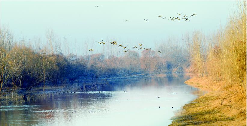 京杭大运河德州段成群的水鸟